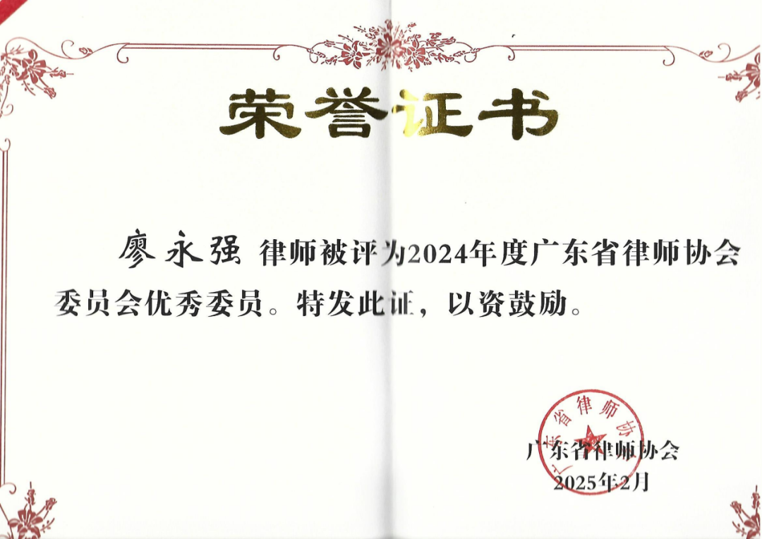 廖永強自2022年4月擔任廣東省律師協會商事調解法律專業委員會副主任后,積極參加委員會活動,深耕專業方向,提出了多項具有建設性意義的意見,獲得了各委員的積極響應,被評為2022年度、2024年度廣東省律師協會委員優秀委員。